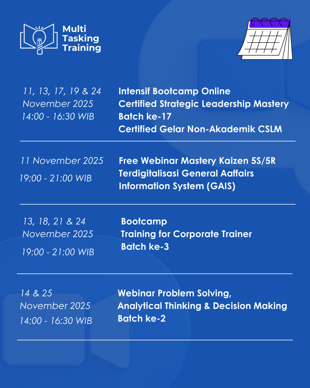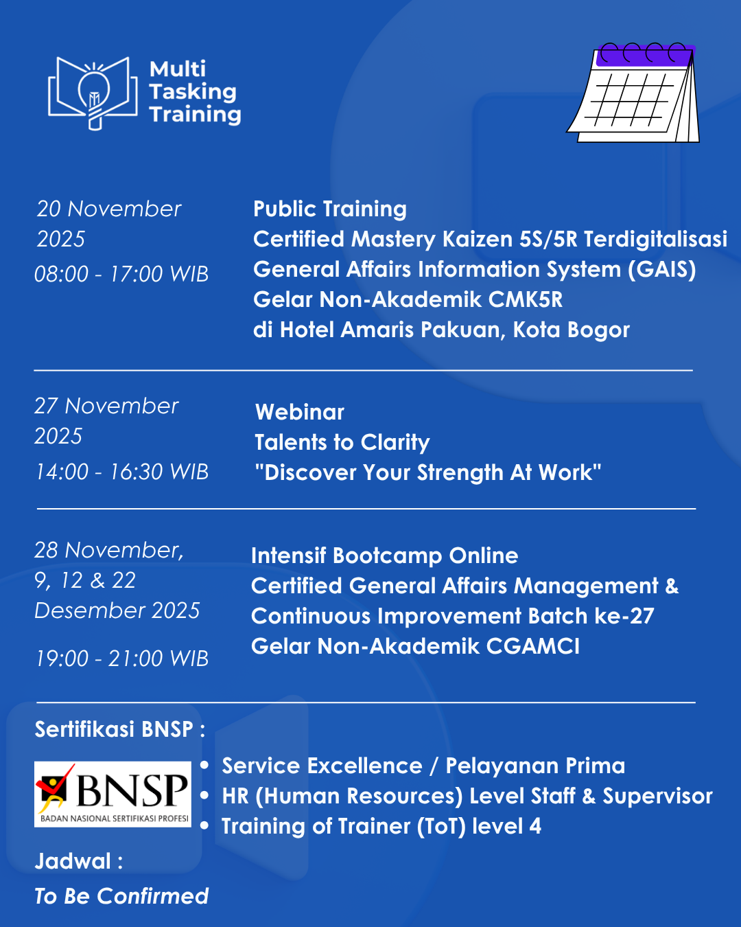 Multitasking Training hadir dengan Pelatihan in-house berbasis praktik dan studi kasus nyata, dirancang untuk meningkatkan fokus, kecepatan, dan hasil kerja.