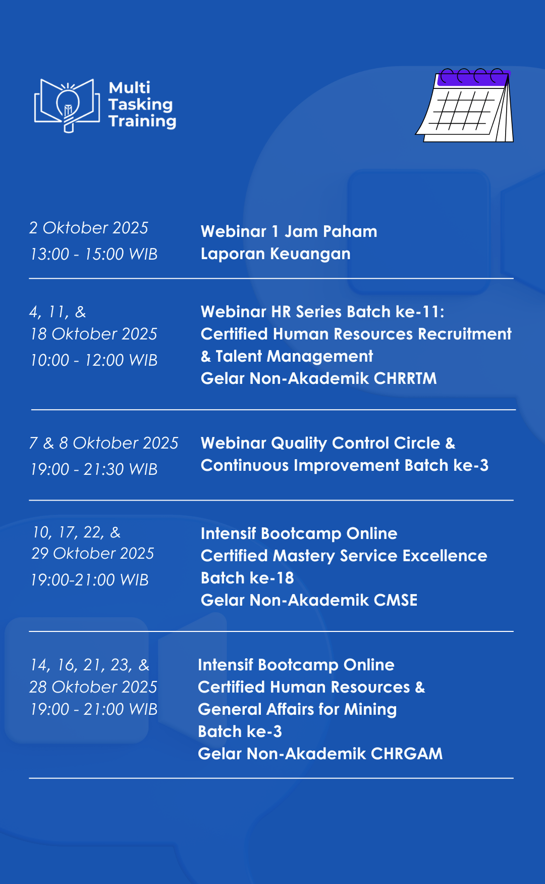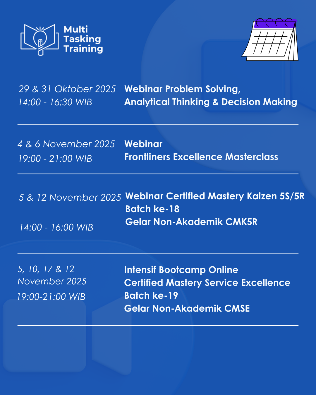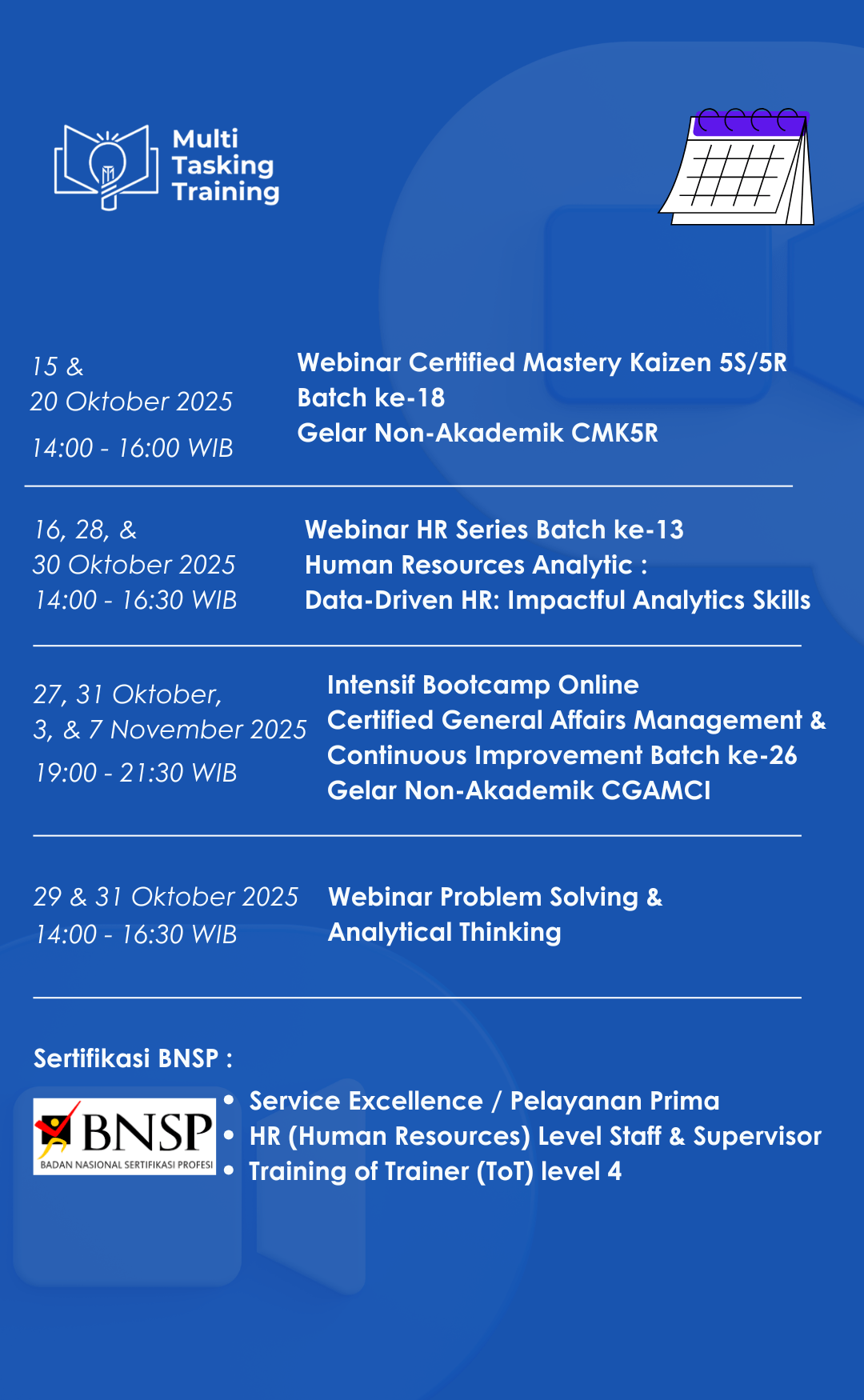 Melalui In-House Training praktis dan relevan, Multitasking Training siap mendampingi perusahaan Anda membangun karyawan yang lebih produktif, disiplin, dan siap menghadapi tantangan.