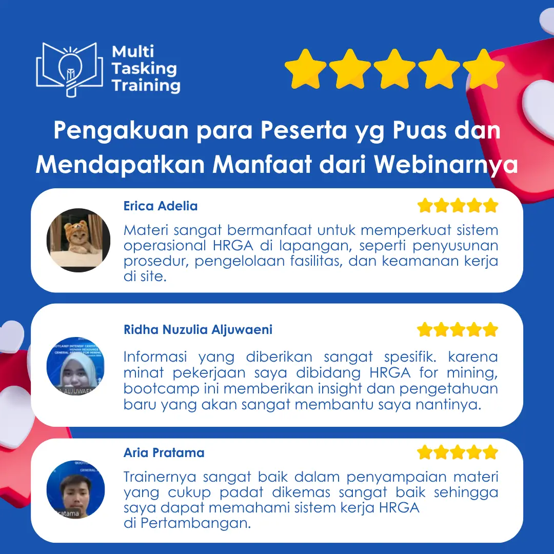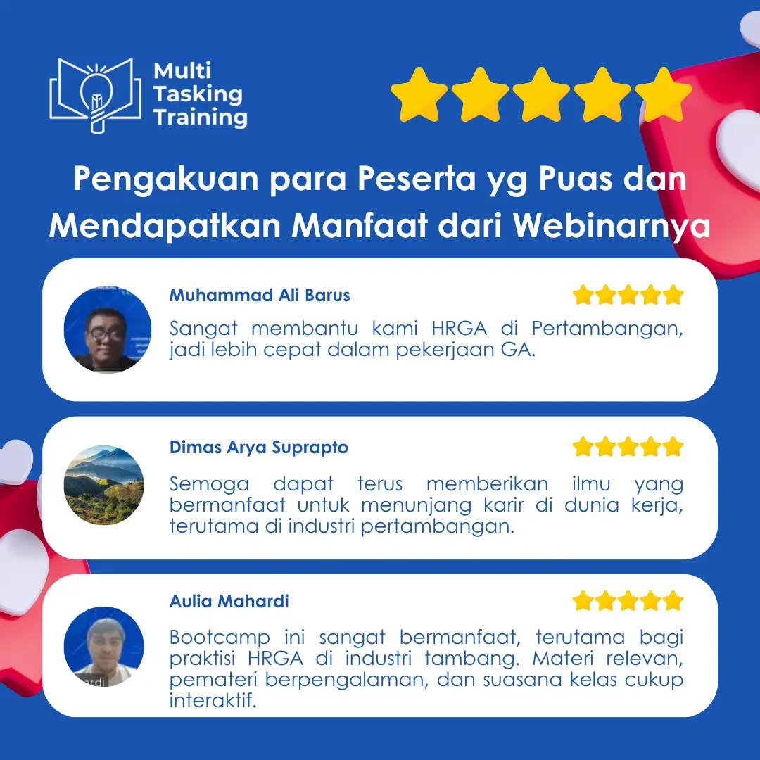 Difasilitasi trainer bersertifikasi & eks-praktisi HR/GA/Operasional (10–15+ tahun). Metode interaktif, praktik langsung.