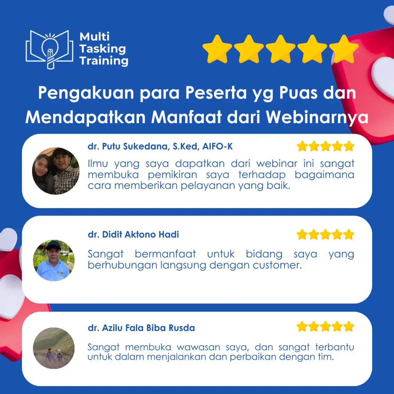 E-certificate, rekaman, materi, WA group Q&A, dan clinic session follow-up (gratis 1x) untuk memastikan implementasi berjalan.