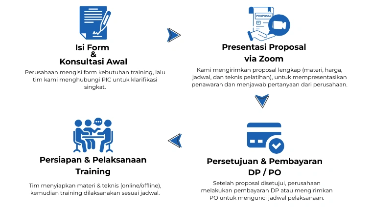 Kami mengirimkan proposal lengkap (materi, harga, jadwal, dan teknis pelatihan), kemudian melakukan Zoom meeting untuk mempresentasikan penawaran dan menjawab pertanyaan dari perusahaan.