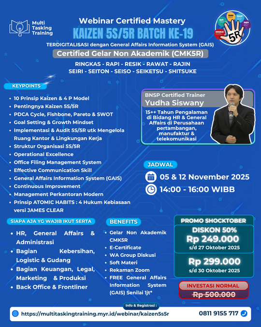 Selain itu akan dijelaskan juga mengenai Modern General Affairs Information System (GAIS), Communication Skill & Problem Solving, Teknik Pembuatan Action Plan, Pemeliharaan Wilayah Kerja Dengan Kaizen 5S/5R, Kompetensi & KPI General Affairs.