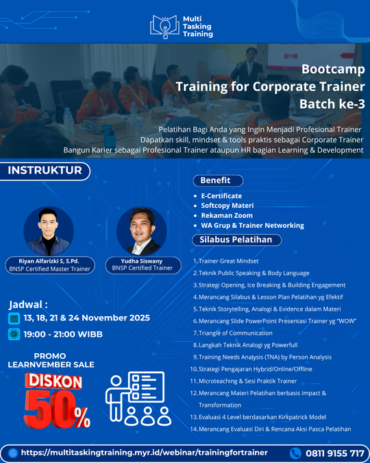 Multitasking Training berdiri sejak tahun 2023 di Kota Bogor yang menyediakan berbagai topik pelatihan seperti: